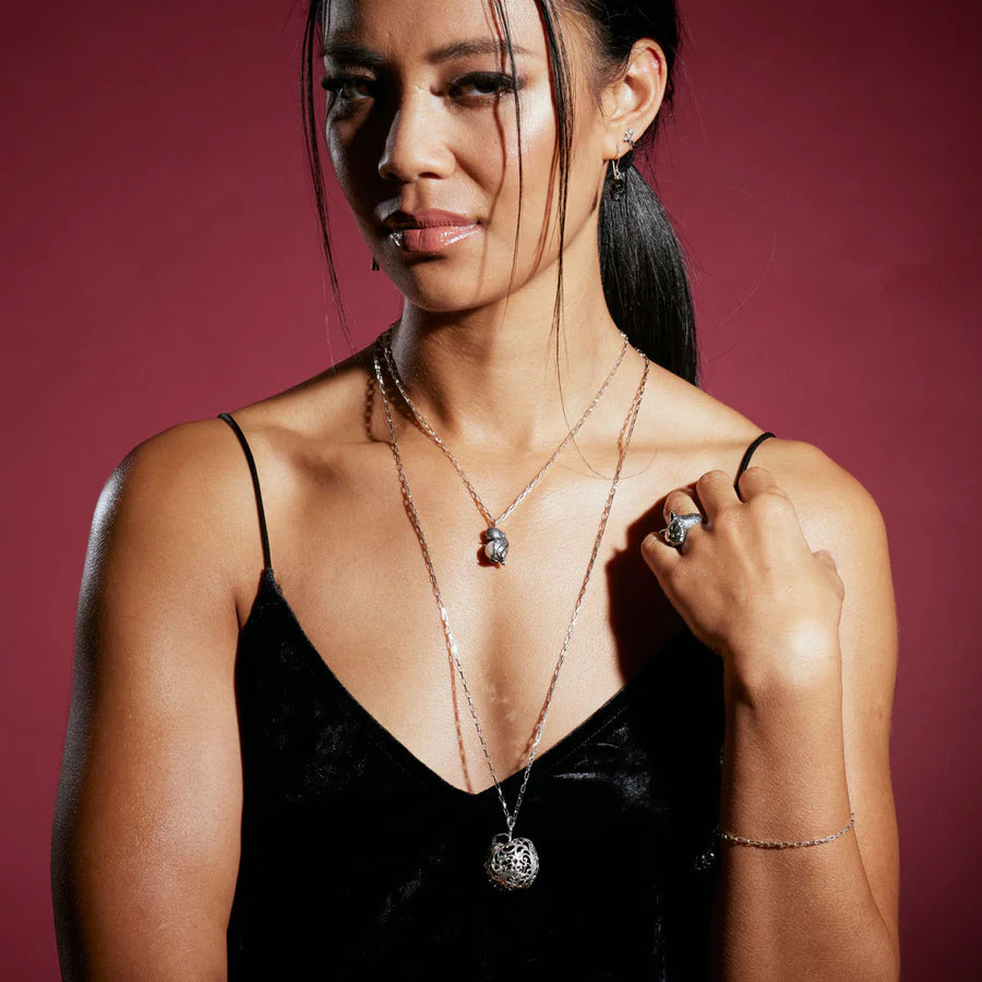 This filigree style silver apple pendant, delicately designed with curls and spiral patterns, features two hidden friends within its design. It serves as a beautiful reminder of the love and admiration for your significant other.